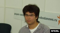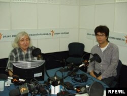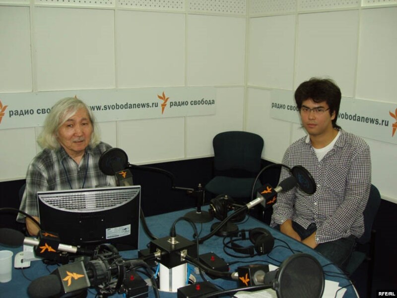 "Азаттыктын" Москвадагы кабарчысы Муса Мураталиев жаш музыкант Азамат Сыдыков менен.