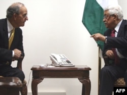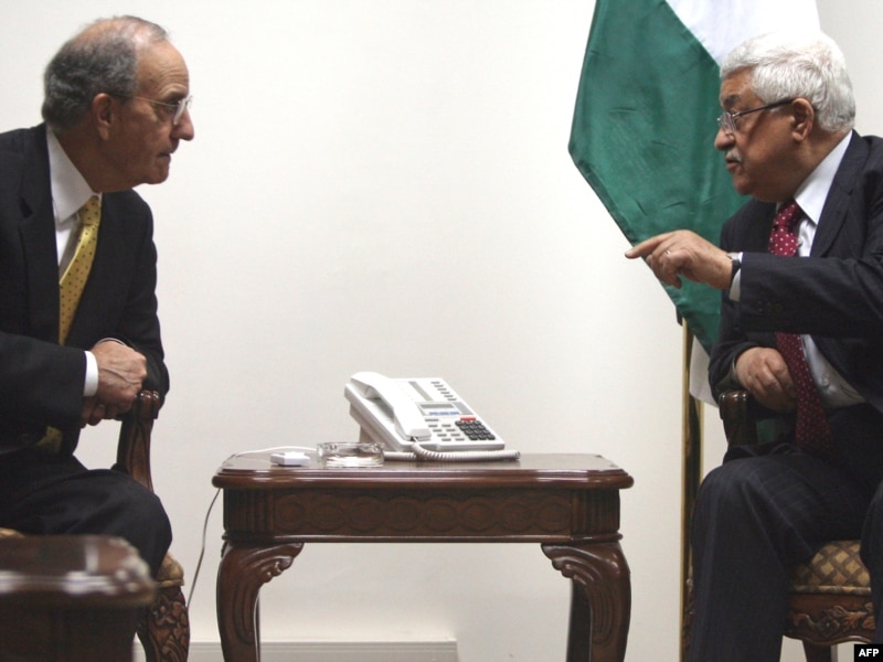 Палестин автономиясынын президенти Махмуд Аббас (оңдо) жана АКШнын Жакынкы Чыгыш боюнча чабарманы Жорж Митчелл (солдо). Батыш Иордандын Рамалла шаары. 10-июнь 2009-ж.