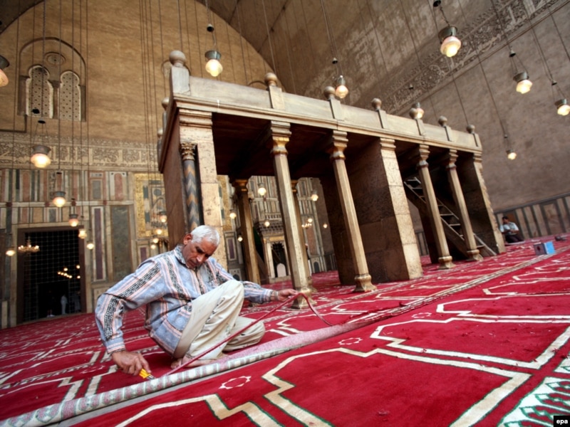 Каирде XIV-кылымда курулган Султан Хасан атындагы мечиттин кызматкери АКШ президенти Барак Обама келер алдында килемди тегиздеп салууда. 2-июнь 2009-ж.