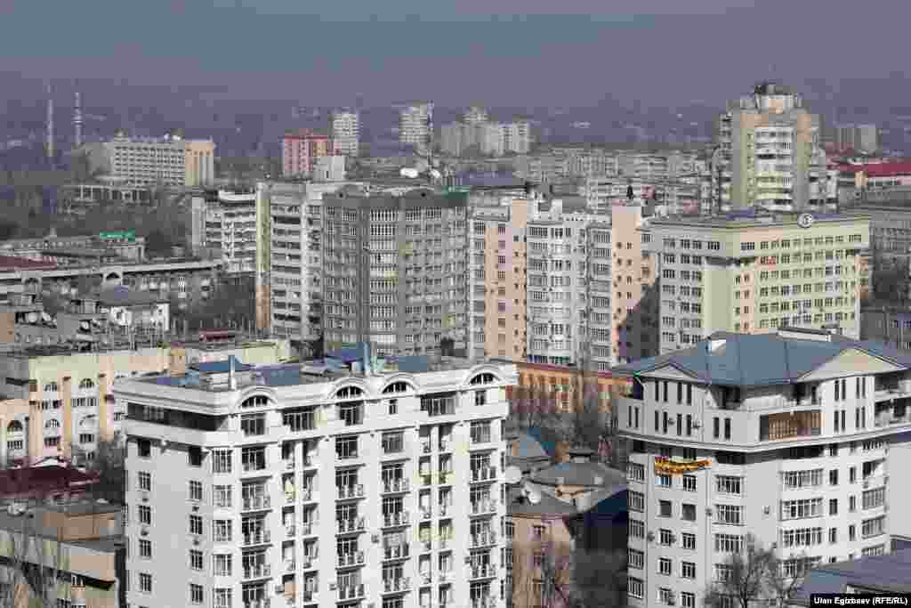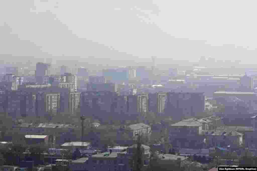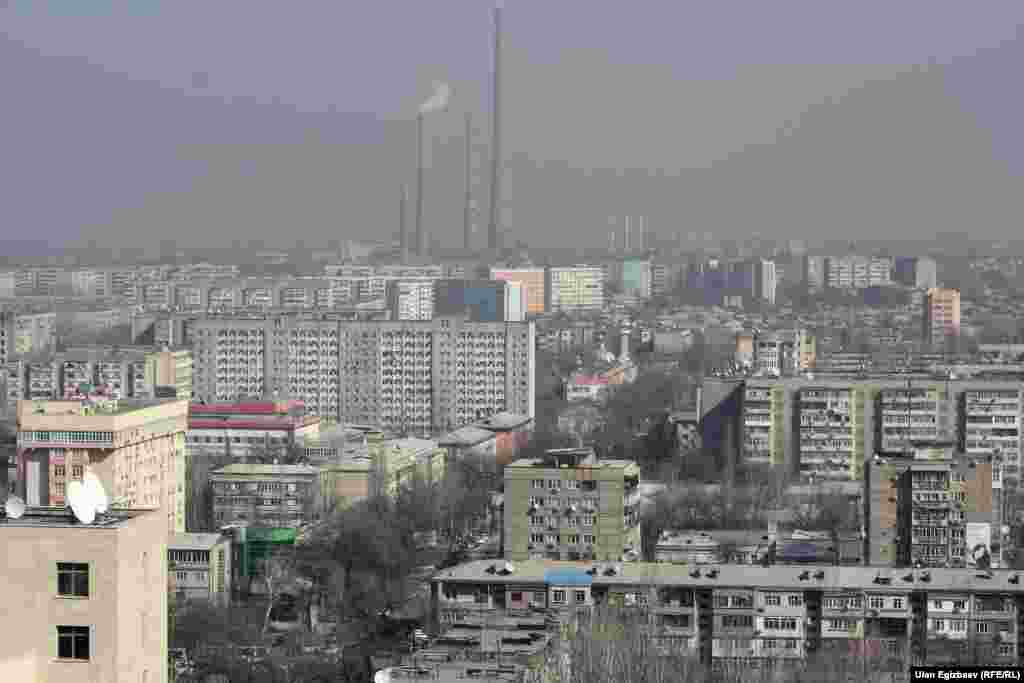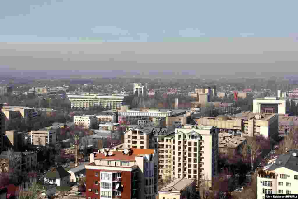 Бишкекте көп кабаттуу имараттар козу карындай жайнаганы менен эң бийиги 18 гана кабат. Бул сүрөттөр “Россия” бизнес борборунун 18-кабатынан, борбордук сааттын үстүнөн жана калаанын түштүк тарабындагы понарамадан тартылган. Бишкекти бийиктен караган адамга түтүнү буркураган Бишкек жылуулук борборунун түтүктөрү дароо көзгө илинет. Автомашинанын көптүгүнөнбү, айтор шаардын үстүн ар дайым кара түтүн басып турарын байкоого болот.