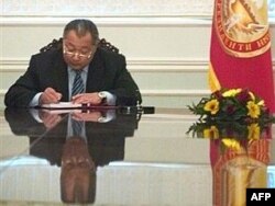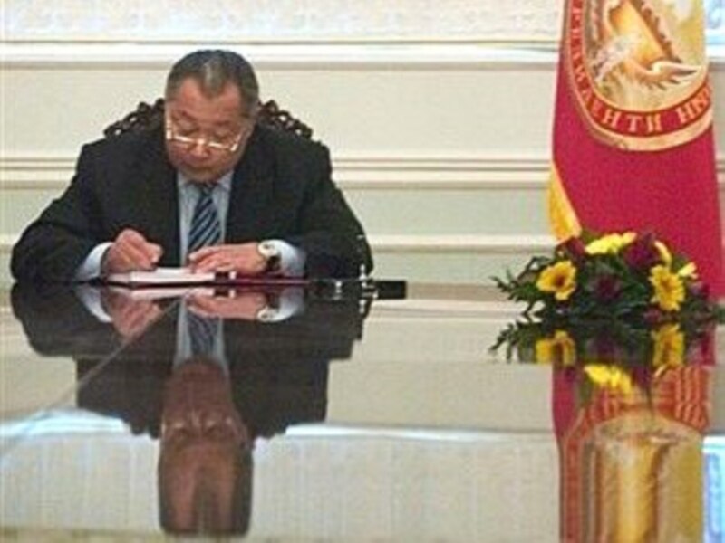 "Азаттыктын" архивинен: Курманбек Бакиев жаңы Конституция тууралуу мыйзамга кол коюп жатат, 23-октябрь, 2007-жыл