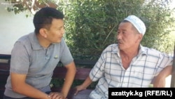 "Азаттыктын" кабарчысы Кубанычбек Жолдошев Социалисттик эмгектин эки жолку баатыры Айтахун Ташировдун эстелигинин жанында жергиликтүү дунгандар менен сүйлөшүп турат. Кара-Суу району, август, 2013.