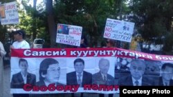 Кыргызстандагы "Саясий туткундарды коргоо" комитетинин активисттери саясий укуктардын бузулушун айтып Германиянын Бишкектеги элчилигинин астына нааразылык акциясына чыгышты. Алар "Меркел айым, Кыргызстанда акыйкаттык калган жок", "Германия, президент Атамбаевди колдоону токтот" жана "Саясий туткундарга эркиндик" деген сыяктуу ураандарды колдоруна көтөрүп турушту.