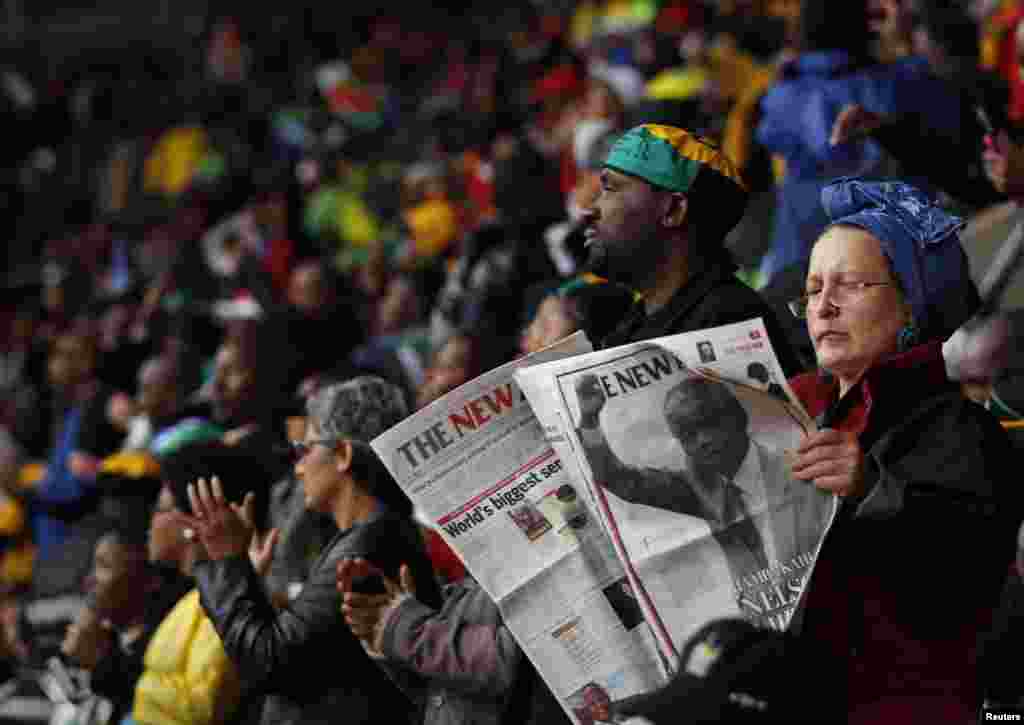 Стадионго келгендер Манделанын сүрөтүн көтөрүп, анын элесине таазим көрсөтүштү.