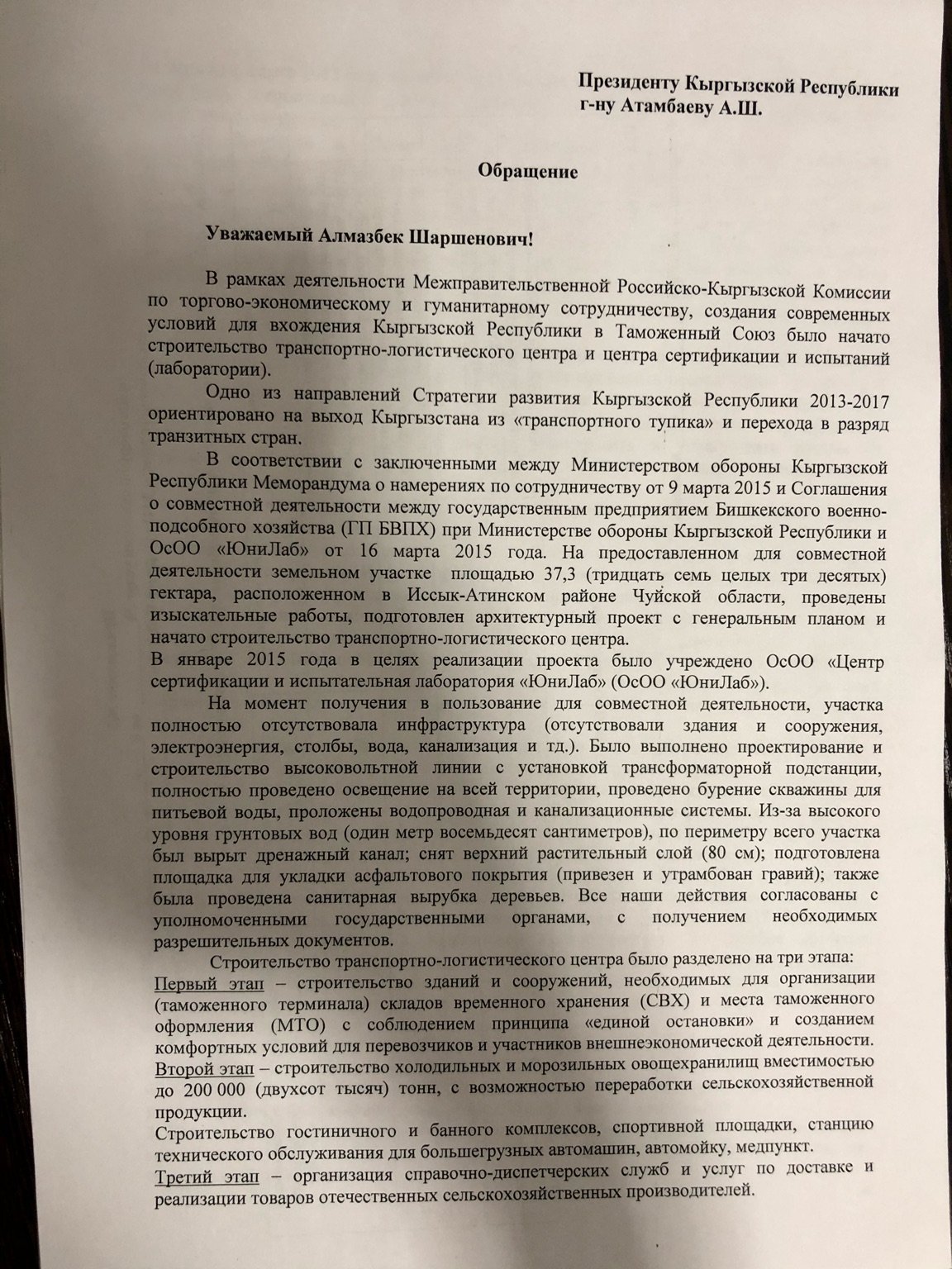 «Мындай теңдешсиз логистикалык борбор өлкө жетекчилиги жана мамлекеттик мекемелердин толук колдоосуна ээ болушу керек эле»,- деп жазган Кенжебаев президентке жөнөтүлгөн, датасы жок жана кол коюлбаган кайрылуусунда. «Бирок Мамлекеттик бажы кызматынын жетекчилиги «ЮниЛаб» логистикалык борборунун иштеп кетишине баардык тараптан бут тосуп, болушунча тоскоолдук жаратууда».  (Сүрөт: OCCRP)