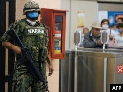 Мексикалык аскер Пантитлан метро станциясында элдин ашыкча топтолбоосуна көз салып турат. Бул да чочко тумоосуна күрөштүн бир жолу. Мехико шаары, 26-апрель